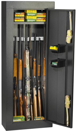 The 8 Gun Security Cabinet is manufactured using the highest grade of raw materials available. With a 7/8 inch steel thickness, this unit provides maximum organization using shelves and removable plastic bins. A four point tubular locking system includes two individually coded keys. Can store up to 8 guns and extras. (Shown in Black)