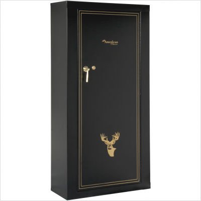 914 Features: -14 Gun cabinet. -Black finish. -Gun cabinets are constructed with powder coated, scratch resistant 18 gauge steel. -Photoengraved wood grain accented interior and door lining. -Hardware: Antique Brass Finish. -The barrel rest and butt plate are lined with felt for scratch-free storage. -The Woodmark Series cabinets feature an extra secure three-point locking system. -Silk screened gold stripes and striking deer head silhouette adorn the powder coated black finish. -Adjustable shelving. -Floor levelers adjust for uneven floors. Specifications: -Ships Ready to Assemble. -ISTA 3A Certified. -American Furniture Classics provides 90 days warranty. -Overall dimensions: 55'' H x 27.5'' W x 11'' D.