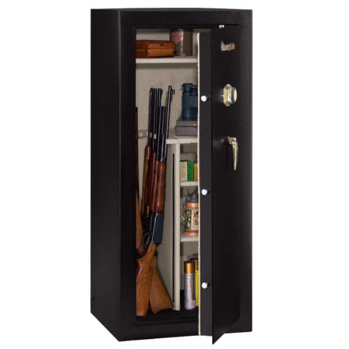 Features: Combination lock 24 long gun maximum capacity 3-number combination lock with lever handle Solid steel pry-resistant door 5 steel live locking bolts/3 dead bolts Concealed hinges Hardened steel plate protects from drill attack Carpeted interior Adjustable shelf 4 adjustable interior configurations Floor compartment Flush floor for easy access Door back organizational hooks Bungee organizational system Color: Black/brass hardware