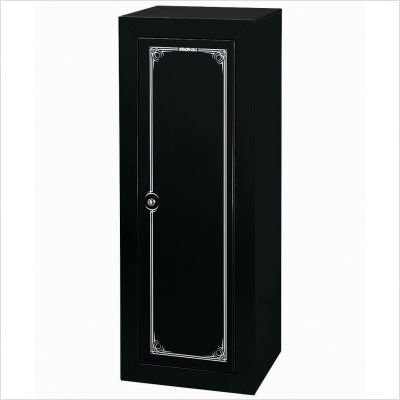 GCB-14P-DS Features: -Gun security cabinet. -Black finish. -Features epoxy paint finish with silver accents on door . -Three point locking system with key coded and double bitted lock. -Holds 14 rifles or shotguns up to 54'' tall. -Removable top shelf for storing hand guns, cameras, and other valuables. -Shelf positioned in the front allows storing longer guns along the back wall of the unit. -Reinforced full sized steel door. -California DOJ approved. -Made in USA. -Manufacturer provides limited one year warranty security plus steel cabinets and pistol boxes.