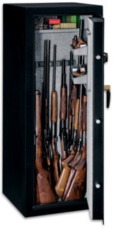 FEATURES: Holds 16 rifles or shotguns. Electronic lock includes operational lights for open, low battery warning and incorrect entry. There is a time out period after 3 incorrect attempts. Batteries are accessible from the front of the safe and are easy to replace. A drill resistant hardened steel plate is located behind the lock for greater security. A trouble key is included. 3 live action locking bolts and 2 steel dead bolts provide 5 locking points. Solid steel, pry resistant door with concealed hinges provides greater security. Fully carpeted interior with Stack-On's patented barrel rests and standoffs for storing scoped rifles allow for better space utilization. A 2-tray organizer is included for storing ammo, cleaning supplies and more. Sturdy hooks allow for hanging items like duck calls or hats. Slot behind the trays is perfect for storing maps, manuals, licenses or other documents. A removable carpeted shelf is included for added storage. Shelf is positioned in the back of the unit so longer guns can be stored in the front along the side walls. Exterior has a black epoxy paint finish with gold accents.