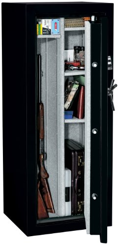 Stack - On Total Defense 14 - gun Safe with Electronic Lock. 8 locking points, waterproof protection and fire resistance! Proven through rigorous testing to store and safeguard up to 14 rifles and shotguns, the Stack-On Total Defense Safe has your peace of mind locked up! No matter where the threat is coming from, this impenetrable security solution has you covered against... Fire: ETL fire rated to manufacturer's specifications for 30 minutes up to 1,400 degree F; Door stripping expands when exposed to high temps, sealing the safe's contents from harm during fire; Water damage: Synthetic rubber gasket and other sealants on the body of the safe keep water out... in up to 2' of standing water for up to 72 hours; Burglary or "curious" hands: 4-way locking with 5 large, live action steel locking bolts and 3 solid steel dead bolts on the hinge side of the door, provide 8 locking points for greater security; 3-spindle handle; Solid steel, reinforced pry resistant door provides greater security; Easily programmable electronic lock with "trouble key" override; Time-out period after 3 incorrect combination attempts; Hardened steel plate is located behind the lock for greater security; Even more features: Versatile: fully convertible safes hold 14 rifles or shotguns or 7 guns plus storage or just shelves for storage; Extra thick door frame and silk-screen detail on the door give these safes a more robust look and feel; Fully carpeted; 6 adjustable shelves; Stack-On's new patented barrel rests and standoffs for storing scoped rifles are adjustable to accommodate different gun lengths and allow for better space utilization; Exterior has a jet black, wet paint, reflective finish with chrome accents and silk-screen on the door; UL listed. California DOJ approved; Fastening hardware is included. Pre-drilled mounting holes. External dimensions: 19" w. x 20 1/4" d. x 59" h. Internal dimensions: 16 2/3" w. x 15" d. x 52 4/5" h. Weighs 315 lbs.; Note: Not recommended for storing CDs