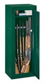 FEATURES: Holds 14 rifles or shotguns up to 54 tall. 3 point locking system with key coded, double bitted lock for greater security. Removable top shelf provides ample storage area for hand guns, cameras and other valuables. Pre-drilled mounting holes allow for easy attachment to the floor or wall. Fastening and finishing hardware included. Elegant gold accents on cabinet door.