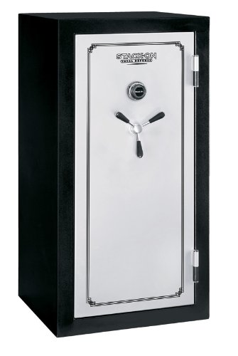 FEATURES: Holds 28 guns or 14 guns plus storage or just storage. 3-number combination lock with a drill resistant, hardened steel plate behind the lock provides greater security. 5 large, live action steel locking bolts and 3 solid steel dead bolts, on the hinge side of the door, provide 8 locking points for greater security. Includes 3-spoke handle with rubber grips. Solid steel, reinforced pry resistant door provides greater security. Extra thick door frame and silk screen detail on the door give these safes a more robust look and feel. Interiors of the safes are fully carpeted with 6 adjustable shelves. These safes include Stack-Ons patented gun barrel rests and patented standoffs for scoped guns. Standoffs allow scoped guns to stand upright in the safe without taking extra space. Bodies of the safes have a black powder coat paint finish; doors are silver gray with a black silk screen. Hardware has a chrome finish.