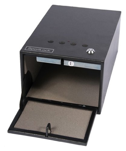 SportLock SafeLock Front Load Electronic Safe. Gives you quick access to your guns when it matters most! Keep your handgun locked safely away right here! Start with top-quality steel construction... you can't pry this bad boy with a crowbar if you tried! And with over 1,000 combinations to choose from, you can rest assured your guns will remain neatly tucked away from curious fingers. Plus, if you have other small valuables, this is the perfect place to keep them! Room for guns and valued possessions: Permanent mounting openings so you can bolt to the floor or wall; Padded interior keeps your guns and valuables mar-free; Back-up key included for access if you forget the code; Interior light for clear vision; Runs on 8 "AA" batteries (not included); Measures and weighs 13 lbs.; California DOJ approved. Come and get yours today! SportLock SafeLock Front Load Electronic Safe
