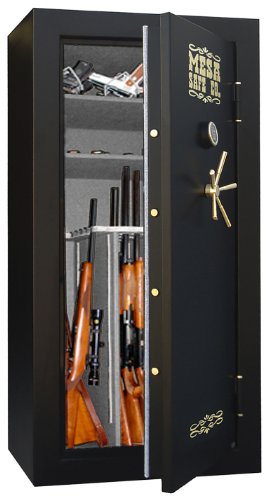 Mesa 22 - Gun Safe. Fire - safe, tamper - safe... the best protection money can buy for your guns and more! Mesa combines the lock-tight security of a burglary safe, with the peace-of-mind of a fire safe! The result is over-the-top protection... the 1 1/2" reinforced steel door is deep-deadbolted in 4 spots for top-notch burglary proofing, and the Safe can take up to 1 hour in a blazing 1,750 degree F fire! Roomy, too... plenty of space for 22 long guns, plus fully upholstered shelving and walls for jewelry, documents, high-priced equipment, and more. You work hard for everything you have. Don't let some shady type make off with your valuables keep it on "lockdown" and sleep easy with a Safe from Mesa! No entry: Rugged 12-ga. unitized steel construction is no-doubt-about-it rock solid; 1 1/2" steel door is reinforced for added tamper proofing; Massive 1" diameter solid steel live locking bolts lock deep in the body, preventing door removal during forced entry; Battery-operated electronic lock is protected by a drill-proof hard plate and a spring loaded re-locking device; 1-hr. fire rating in temps up to 1,750 degree F; Holds 22 rifles, plus the upholstered interior shelving can be arranged to meet your unique storage needs; 4 anchor hole points provided to secure Safe to the floor; Textured finish, with decorative brass trim and handle; Interior dimensions: 55 1/2 x 28 1/2 x 14 1/4" d. 13 cubic feet of total storage volume; Exterior dimensions: 59 x 30 x 21" d. Weighs 710 lbs.; Order yours today! Please Note: This item is shipped directly from the factory. This item will be shipped by commercial carrier curbside. Ships in 1 box: 48" x 48" x 64", 759 lbs. Mesa 22-Gun Safe .