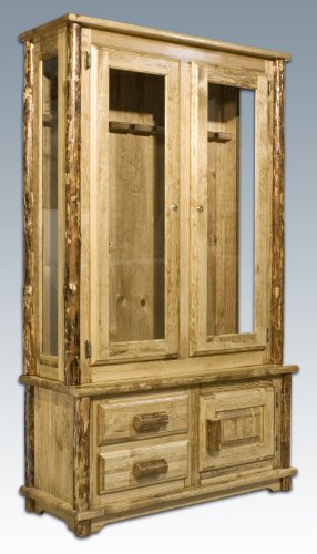 Montana Woodworks Glacier Country Gun Cabinet. Rustic charm any sportsman would love! Showcase your favorite rifles and shotguns in this elegantly handcrafted Cabinet that is sure to have your fellow sportsmen feeling a little jealous. What better way to store your prized guns than having them embraced by the timeless beauty of lodge pole pine while still enjoying them through the glass? Designed not only with beauty in mind, but also durability and enduring quality. Holds 8 rifles or shotguns protected by lock and key. Underneath that are 2 small drawers and a third door that easily holds your ammo and other sporting essentials. Its one-of-a-kind "Glacier Country" look is achieved by removing the outer bark while leaving the inner layer. 3 coats of premium-grade, clear lacquer are then added for the finishing touch. 42 w. x 17 d. x 6' h. Fully assembled. Note: Log furniture is subject to the natural process of checking or splitting as the wood releases moisture. No compromise on strength, only builds character. Order Today! Please Note: This item is shipped by commercial carrier curbside. Curbside delivery (i.e., liftgate delivery to the curb) is required for this item. Ships in 1 box: 42" x 17" x 72", 161 lbs. Montana Woodworks Glacier Country Gun Cabinet