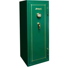 Homak 16-Gun Steel Electronic Lock Gun Cabinet - Hunter Green Homak 16 Gun Electronic Safe combines high-end security with a durable design. Features of Homak Electronic Lock Gun Safe include carpet-lined Interior, adjustable shelf. built-in adjustable barrel rests, plastic barrel rests for multi-length gun barrels. Cabinet is DOJ Certified. 22.00 L. 60.00 W. 60.00 H.